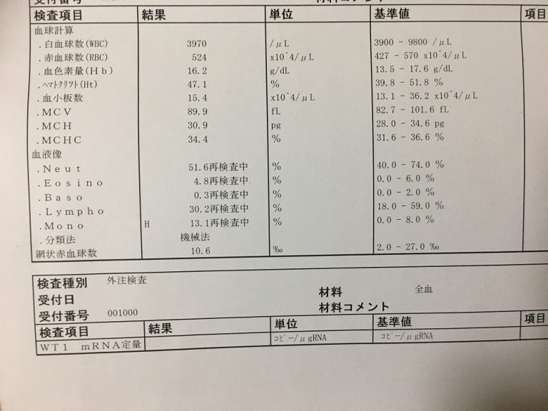 腫瘍マーカー(WT1検査)は、当日結果が出ないので次回外来時にわかりますが、血液検査は、見事異常なしです。